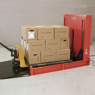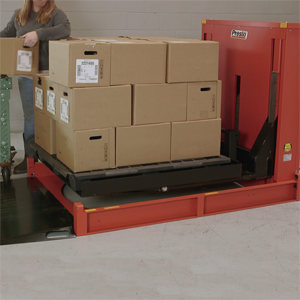 The P4 Floor Height Load Leveler with built-in Turntable can be loaded or unloaded with an ordinary hand pallet truck. Load height is easily adjusted by the operator to keep the top layer of boxes at a comfortable, easy-to-access height.