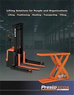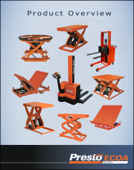This 8 page color brochure provides a basic overview of all the products offered by Presto ECOA Lifts including stackers, lift tables, tilters, and pallet positioners.